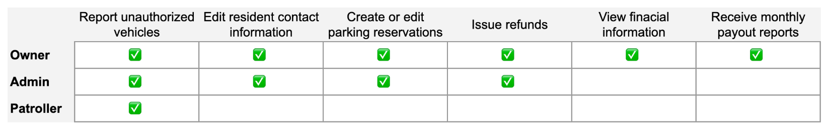 Here's a breakdown of the different levels of access Patroller, Admin, and Owner roles have: